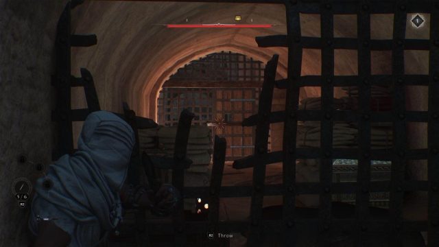 Once you’ve killed the guards on one end of the storeroom where the chest is located, you’ll need to get to the opposite side of the room. When you find the small opening in the gate, use R2 to select your throwing knives. Aim for the bar locking the door from the inside and throw a knife at it.