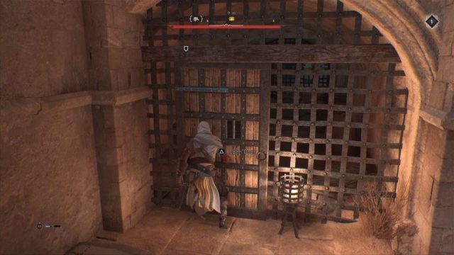 To obtain the Zanj Uprising Sword upgrade schematic inside the Damascus Gate Prison, you’ll need to bring some throwing knives, find the front door of the prison, and be prepared to stealth kill two guards.