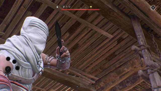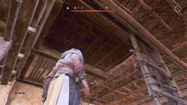 Once you’ve killed the area of guards, you need to find the entrance to the building. Using Eagle Vision, you’ll notice the Gear Chest on the second floor. Above you and where the ladder is situated, use one of your throwing knives to break the floor. Climb up the ladder and loot the chest.