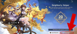 In the main menu, there will be three different icons to select on the bottom left hand of the screen. One of these will give you the option of Claiming Sushang. By opening this, you’ll get the screen of the Neighborly Helper and it’ll indicate to you what your Prosperity Level is at currently. In order to unlock Sushang, you must raise your Prosperity Level to at least Level 8. When you do, you can return to this screen and select the Claim Character button on the bottom right hand of the screen. Sushang will then join your roster or you will receive a notice from the Characters Icon of your hot bar that you can unlock an Eidolon for your Sushang.