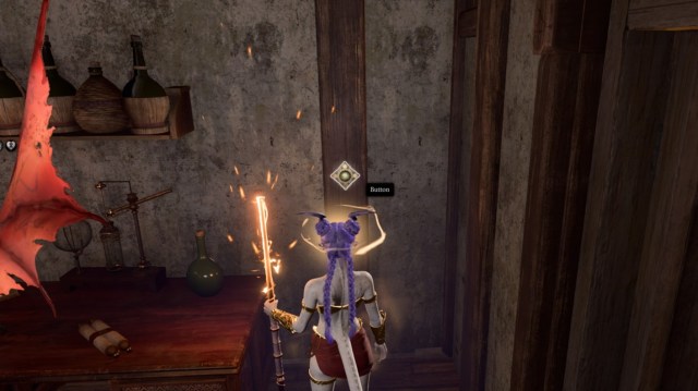 Once you’ve told Devella about the quest, she’ll leave to protect the richer folk. It’s now up to us to inform the Lower City targets. But before you go, inspect the wine rack in the corner of the room. If you pass a perception check, you’ll see that one of the wine bottles is strange.