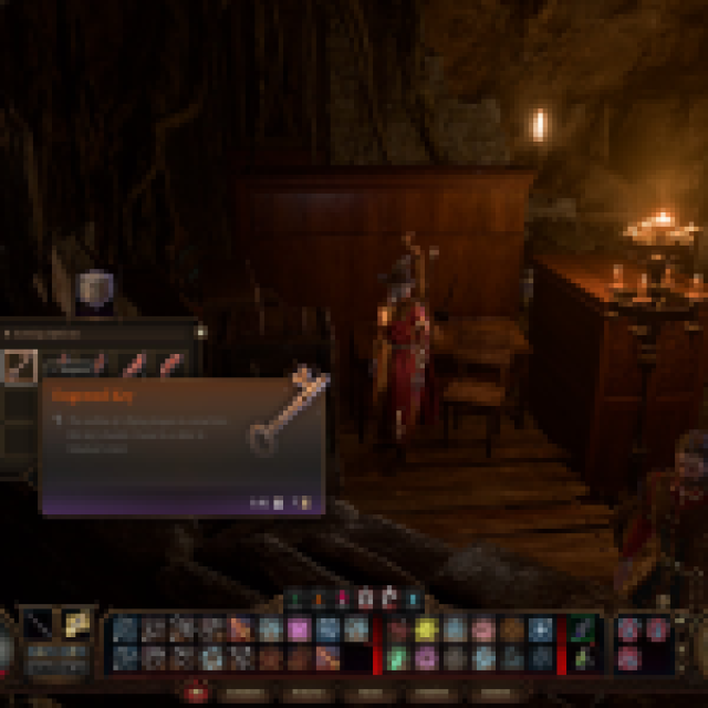 Head towards the back of the cellar. Examine the crate near the desk, and you’ll find an Engraved Key.