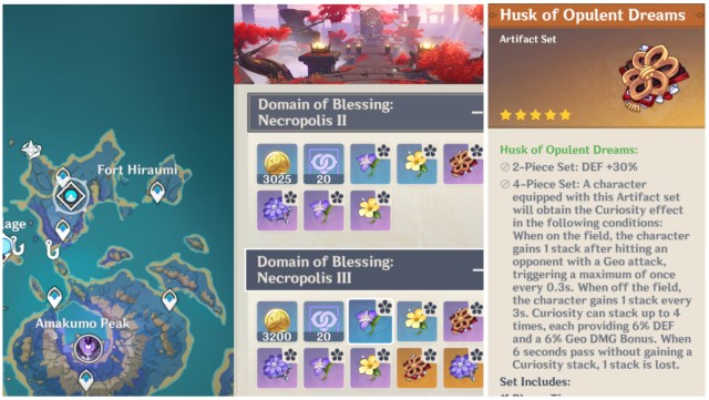 Luckily, if you were expecting Itto’s run then you could have prepared for the artifact domain. Unlike many of the characters that are released now, Itto’s domain is readily available for grinding without any more exploration or puzzle-solving on your part. Husk of Opulent Dreams, in the Inazuman Domain Slumbering Court, is the best set that you can put on Itto and it’s recommended that you go ahead and try for the four pieces even if you have some that are not all that good and ready yet. At two pieces, Husk boosts the character’s defense by 30 percent and at four pieces, it’ll increase both defense and Geo damage.