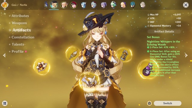 If you just started to build her and have no complete set, using any combination of these 2-piece effects will be fine. The endgame goal is still completing a Nighttime set, but Navia can hold any amalgamation of artifacts as long as they have good enough stats for her.