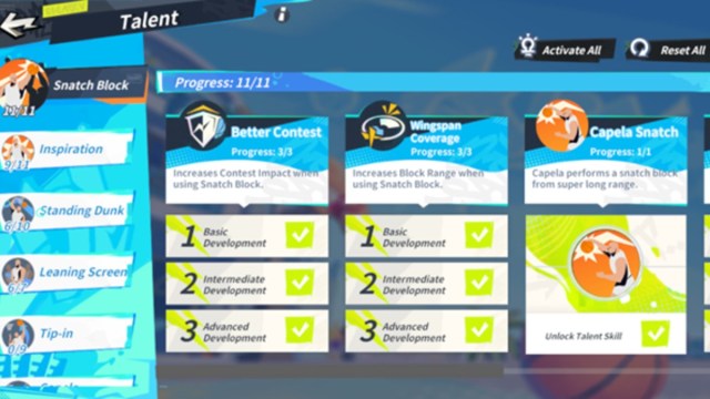 The next talent category you want to max out is the Snatch Block. This talent will improve your Contest Impact (which affects the opponent’s accuracy), Block Range, and restore Morale after a failed attempt of doing Snatch Block.