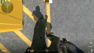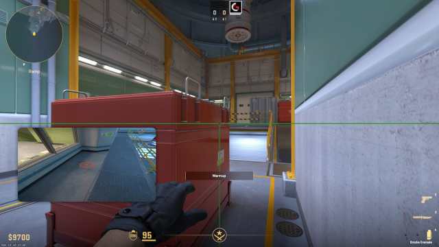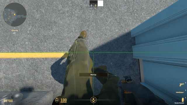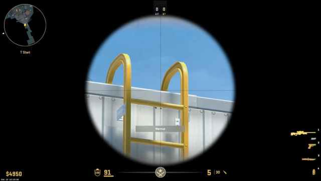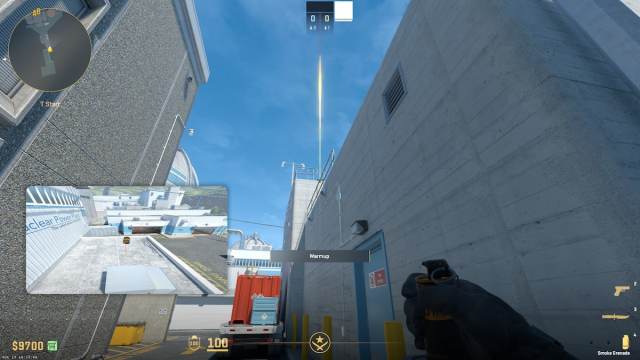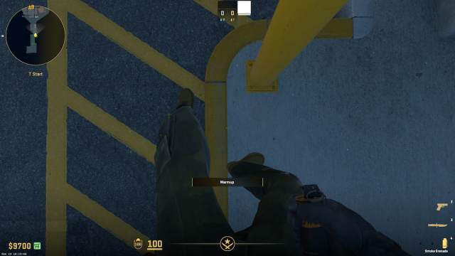 This one is important, regardless of other smokes that your team may or may not use during a round. The line-up is easy; you will not believe it. There is a small painted corner next to a yellow box at the gate of the T Spawn. Look down on it, then look at the top end of the right side of the ladder (the left edge of it, as pictured below) and press the jump throw key. You can also see the results below. A slight misalignment may open a “crack” between the smoke curtain and the edge of the garage door.
