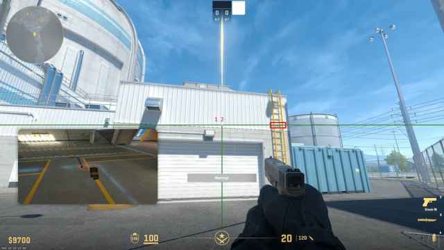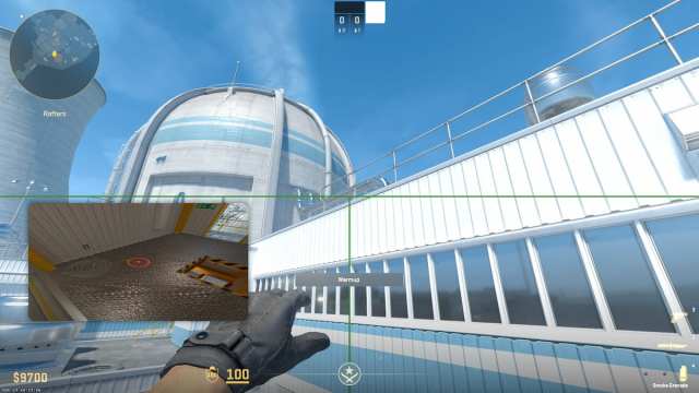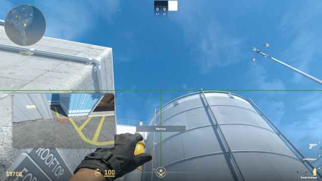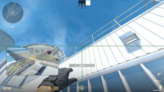 Are you pestered by CTs sniping you from Heaven as you enter A? Are you fed up with being attacked from other positions because you are forced to watch Heaven? Look no further, as I’ve got just the solution for you that might not be easy to learn, but it will terrorize CTs once you master it. Hop on under the top of the Silo, and stand on the line that is at the start of the arrow sticker while hugging the Silo. This one is tricky to learn, but I’ve found a possibility to connect the right crosshair line with the top edge of the windows at the very edge of the screen, which you can see below. When you manage to set up the line-up, just throw the smoke and watch the magic. No jump-throw is needed, so you can only train with the preview. Toy around with the angle a bit, and you might find an even better smoke position, but this one also works. We are talking about microscopic changes, which means that a mini-slip-up results in the smoke grenade going god-knows-where.
