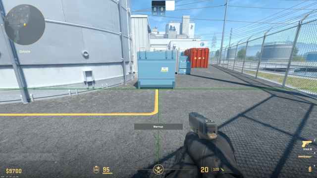 We are revisiting the “paint corner” place just outside the T Spawn gate for this lineup. Once you stand there, point to the crosshair, as picture number two indicates. The vertical line of your crosshair should align with a line on the blue container and the object on top of the Silo, and the horizontal line should align with the top of the Silo. Use your jump-throw to release the smoke.