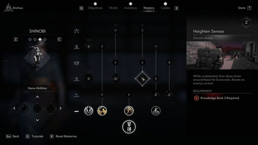 Heightened Senses – While undetected, time slows down around Naoe for 8 seconds. Once seen, the ability disappears.