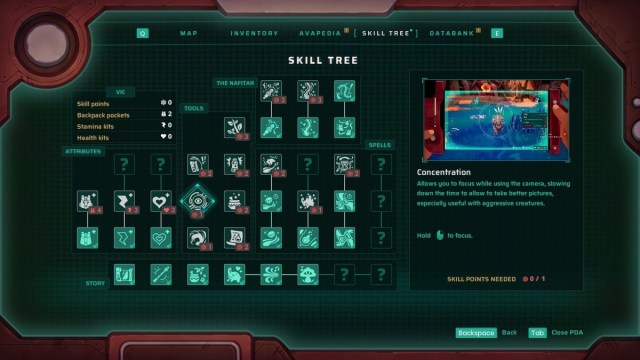 If you have noticed a research task under the creature page in the Avapedia, you’ll need a picture of an infected version of every creature in Creatures of Ava. Speaking from experience, the most damage you’ll take is from trying to take a photo of an infected creature. They’ll constantly attack you and you can’t dodge with your camera up. Concentration allows you to do this research task effortlessly.