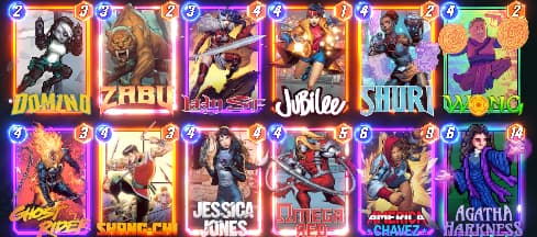 # (2) Domino - Guaranteed 2-Drop (Do not go for Sentinel, no point) # (3) Zabu # (3) Lady Sif - If played on curve, you are free from Agatha's Curse # (4) Jubilee - Can dig out Lady Sif, Wong, who knows? # (4) Shuri # (4) Wong # (4) Ghost Rider - You discarded Agatha? Cool. # (4) Shang-Chi # (4) Jessica Jones # (4) Omega Red - Wong + Shuri + Omega Red = PAIN # (6) America Chavez - Filler, so that you can draw other cards faster. # (6) Agatha Harkness # eyJDYXJkcyI6W3siQ2FyZERlZklkIjoiWmFidSJ9LHsiQ2FyZERlZklkIjoiTGFkeVNpZiJ9LHsiQ2FyZERlZklkIjoiRG9taW5vIn0seyJDYXJkRGVmSWQiOiJBbWVyaWNhQ2hhdmV6In0seyJDYXJkRGVmSWQiOiJBZ2F0aGFIYXJrbmVzcyJ9LHsiQ2FyZERlZklkIjoiR2hvc3RSaWRlciJ9LHsiQ2FyZERlZklkIjoiSnViaWxlZSJ9LHsiQ2FyZERlZklkIjoiU2h1cmkifSx7IkNhcmREZWZJZCI6Ik9tZWdhUmVkIn0seyJDYXJkRGVmSWQiOiJTaGFuZ0NoaSJ9LHsiQ2FyZERlZklkIjoiV29uZyJ9LHsiQ2FyZERlZklkIjoiSmVzc2ljYUpvbmVzIn1dfQ== # # To use this deck, copy it to your clipboard and paste it from the deck editing menu in Snap. You can always retreat early if the card flow is not going well. It’s hilarious because people never expect it, and there are not many errors Agatha can make here compared to some other decks.