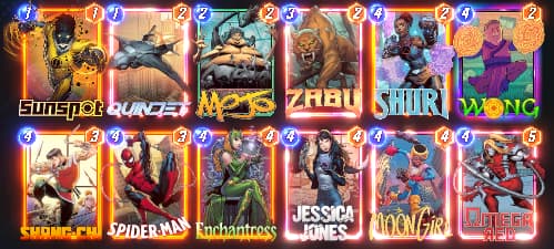 # (1) Sunspot - He likes to devour unused Energy # (1) Quinjet - For Moon Girl plays # (2) Mojo - 2-Drop to fill the Curve # (3) Zabu # (4) Shuri # (4) Wong # (4) Shang-Chi # (4) Spider-Man - Imagine going Zabu on 3rd turn, Moon Girl on 4th turn... This gives you two Spider-Men to heavily disrupt the opponent's plan # (4) Enchantress - Purging Ongoing effects for 2 Energy (with Zabu) is never bad # (4) Jessica Jones - With or without Wong, she's cool # (4) Moon Girl # (4) Omega Red - Absolutely mind-shattering on Turn 5 or 6 because almost NOBODY expects it. # eyJDYXJkcyI6W3siQ2FyZERlZklkIjoiU3BpZGVyTWFuIn0seyJDYXJkRGVmSWQiOiJTaGFuZ0NoaSJ9LHsiQ2FyZERlZklkIjoiSmVzc2ljYUpvbmVzIn0seyJDYXJkRGVmSWQiOiJPbWVnYVJlZCJ9LHsiQ2FyZERlZklkIjoiU2h1cmkifSx7IkNhcmREZWZJZCI6IkVuY2hhbnRyZXNzIn0seyJDYXJkRGVmSWQiOiJaYWJ1In0seyJDYXJkRGVmSWQiOiJNb29uR2lybCJ9LHsiQ2FyZERlZklkIjoiTW9qbyJ9LHsiQ2FyZERlZklkIjoiU3Vuc3BvdCJ9LHsiQ2FyZERlZklkIjoiUXVpbmpldCJ9LHsiQ2FyZERlZklkIjoiV29uZyJ9XX0= # # To use this deck, copy it to your clipboard and paste it from the deck editing menu in Snap. Shanna is now on the scene, so expect to see more of her, we’ve heard Zabu works wonders with Shanna: