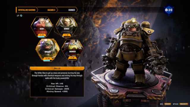 Driller is the “bruiser” of the group, he is kind of tanky and also has decent weapons (you can start quite the fire), and, what’s most important, insane drilling skills. You will greatly appreciate this as soon as you start playing as a Driller because it will significantly speed up your resource farming.