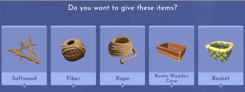 Rustic wooden cases and baskets are located under “Furniture” in the crafting station, while rope is a Refined Material. Since you have already gathered all the raw resources needed, start creating each item and return to Moana to begin wrapping up the quest. Make sure you don’t use too much softwood and fiber, since you’ll have to hand these in too!