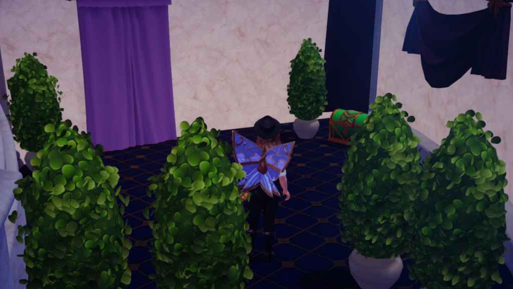 In the memory, you’ll find maroon curtains and a gem door. Aside from this, though, you won’t find any obvious indicators. Where is a place where you’ll find pink curtains and a lot of towers? Dream Castle. Head inside the castle, turn right and head towards the four potted plants to progress further.