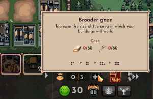 During your run, you can upgrade the King’s Gaze, allowing you to broaden its reach, meaning you can activate more tiles. This results in higher production, research, and more. To upgrade the Gaze, simply click on the plus icon next to the eye with the crown icon: