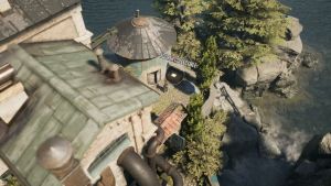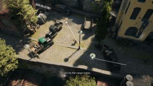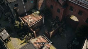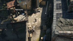 With four collectibles in your bag, it’s still not time to go for the objective marker just yet. Go the opposite route this time, meaning left of the place with the guards. There are two guards in the way, so make sure they’re looking the other way or you’ll get spotted.