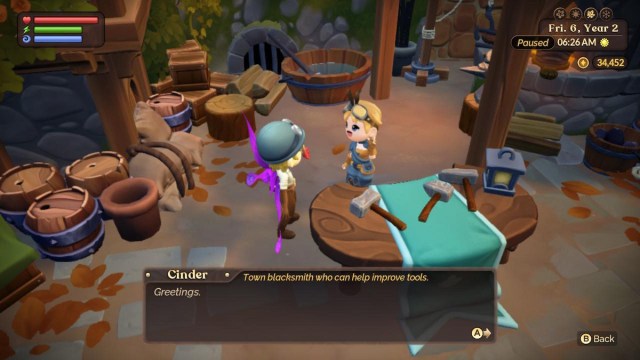 - From your Homestead, head south down the path until you enter Town Square (where the tables are for you to sell items). From here, go down the stairs and then turn right, and you’ll find Cinder.