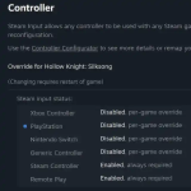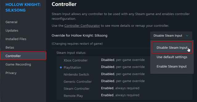 - In the Controller tab, select the Disable Steam Input option under Override for Hollow Knight: Silksong.
