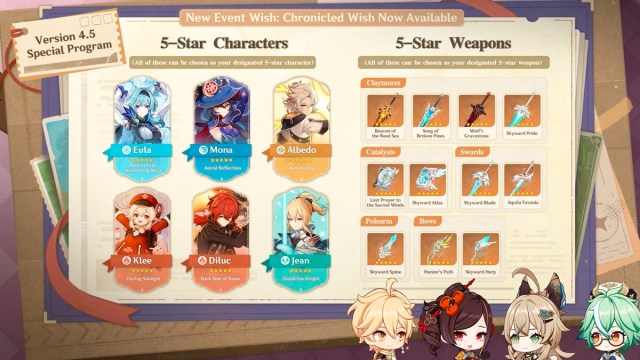 The first banner will be Mondstadt-themed, featuring the three Standard 5-stars Diluc, Jean, and Mona alongside the limited Klee, Albedo, and Eula. The absence of Venti suggests that Archons will be absent from Chronicled Wish. It also implies that the next Chronicled Wish might feature Liyue characters.