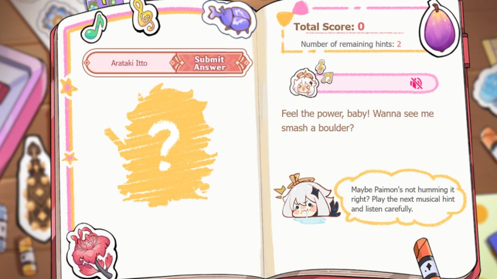 If you’ve been keeping track of new character trailers, this event will be a breeze for you. Click on the sound icon next to Paimon on the right page to start playing a small track sample. Your objective is to discover which character the track belongs to. You can make your guesses on the left page of the book and click on Submit Answer to see the results.