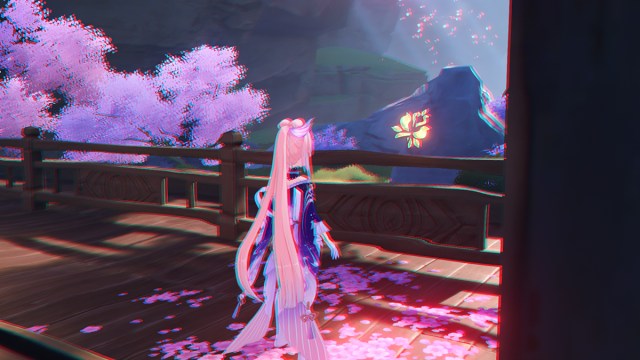 You’ll reach a new room with pink blossom trees. In the northeast of the room, you’ll see a glowing gold spot on the floor. Stand on it and then align the two glowing rocks by aiming your camera until the door in the north opens. Follow the path through again until you teleport back to the leafy area once more.