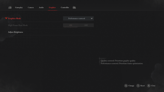 In the Graphics tab, there are three options, “Graphics Mode,” “High Frame Rate Mode,” and “Adjust Brightness.” As mentioned previously, you can choose either Performance Centered or Quality Centered for the Graphics modes. In my personal experience, Performance Mode is the clear winner between the two, thanks to the vastly improved frame rate, which comes in handy during fast-paced Soulslike action.