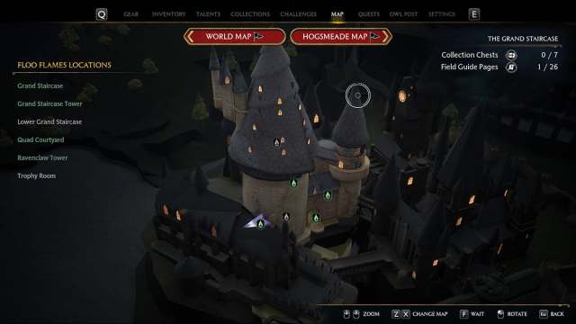 - Astronomy Tower Floo Flame – Up the stairs to find the key, Astronomy Classroom for the cabinet. You’ll see quest markers for both!