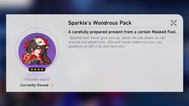 The Sparkle’s Wondrous Pack can be claimed in your email and has one of the best descriptions in the whole game. But what you probably don’t expect is that its contained items are also completely randomized, and can be any of the following: