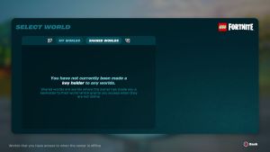 Players who are World Key Holders to someone else’s world can join the shared world at the LEGO Fortnite world menu. Make sure LEGO Fortnite is selected at the main menu, then press Up on the D-Pad to get to the Select World menu.