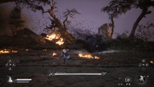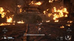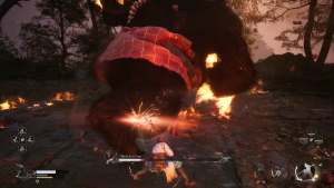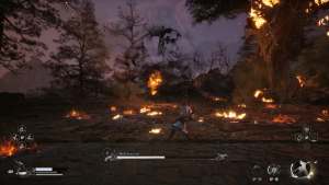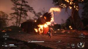 After you bring his HP down to 50%, he’ll smash the ground, and fire will shoot out of the ground. This is your cue to activate the Fireproof Mantle because Black Bear Guai will now do fire damage as well.