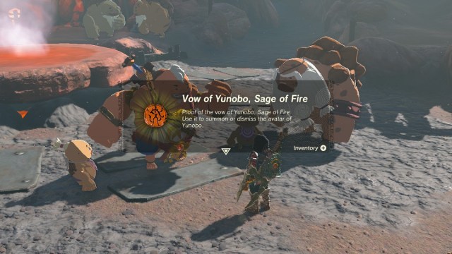 After you defeat Marbled Gohma you get one new Heart Container and the Vow of Yunobo, Fire Sage – the ability to use Yonobo’s power via his companion avatar anytime you want, making it easier for you to crush rocks and enemies in the open world.