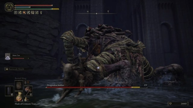 This one’s weird, since it seems to have some closely related variants. As you’re traveling through the Ainsel River area, you’ll probably encounter a boss called “Dragonkin Soldier of Nokstella.” But in locations such as Nokron or the Lake of Rot you’ll find a field boss simply called Dragonkin Soldier. They’re all big and nasty, but the more official boss version has a few extra tricks.