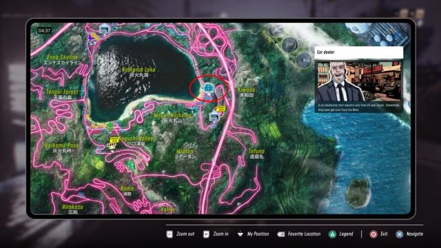 You’ll eventually unlock a new icon on the map. Open the map and look to the east of Haikama Lake and west of Kiwada. Look for the blue car icon, which would be the car dealership. You can’t fast travel to this location, so navigate or place a waypoint on the car dealership icon.