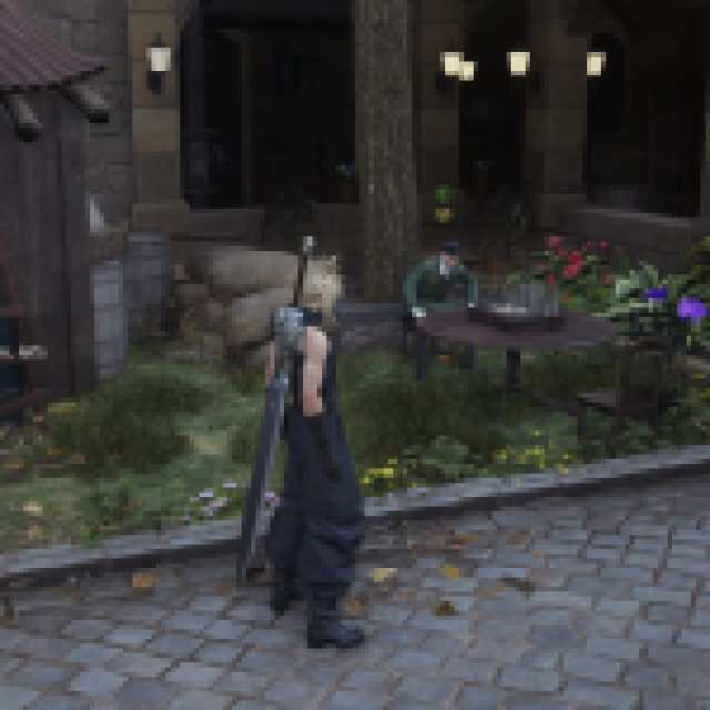 You’ll need to defeat Virgil, who works at the Clock Tower, to get the card back. Leave the bar and head up the Kalm’s city square stairs to reach the Clock Tower. But Virgil isn’t inside. He’s to the right of the Clock Tower in the small green space outside. Speak to him at his table, and you can challenge him to a game.