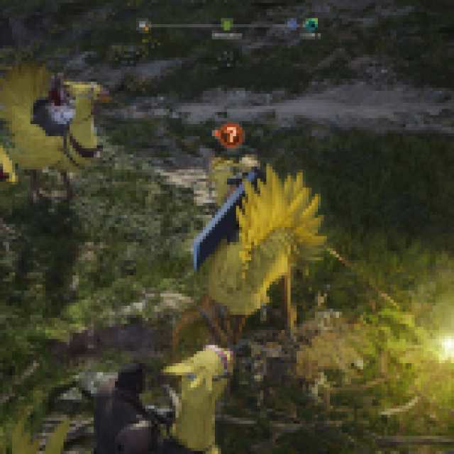 Once you’re on your Chocobo, press and hold the Up button on the D-Pad. Then, use your joystick to move the camera towards the arrow that appears on the question mark bubble above your Chocobo’s head. When you’ve done this successfully, a golden trail will pop up.