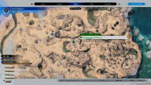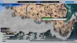 You’ll need to fight a Sandspitter to get to it. Sandspitters are weak to Blizzard, and dodging them when they emerge will pressure them. Once the Sandspitter is dead, you can press up on your D-Pad while on Chocobo to reveal the artifacts’s location just to the right of the blue tarp. Then, press down on your D-Pad to dig up the treasure, which will be the bird trap. There’s also a Karmic Cowl and Armor Upgrades in the area.