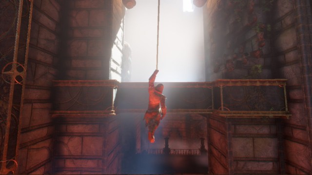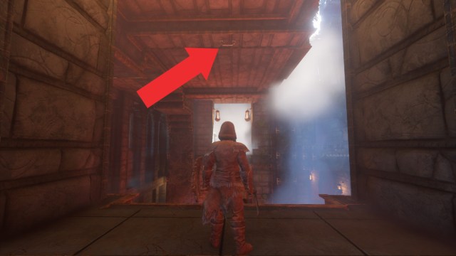 Look toward the ceiling and spot the two grapple points. This is easily the most frustrating part of the journey that you’re on and I can admit that it took more attempts than I would like to admit to nail this part — mainly because I didn’t have a full Stamina bar. If you have any Stamina restoration or boosting items like Water, I would recommend taking a sip before you attempt this part, as Grapple Jumping can be a major drain on your Stamina bar.
