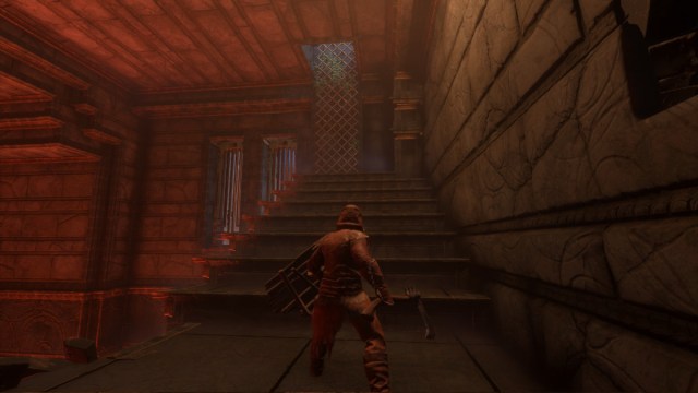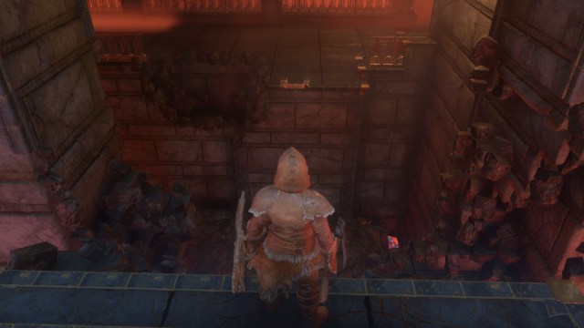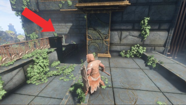 When you first arrive in the Ancient Vault, you may notice a large door ahead of you that is unable to be opened. You’ll need to navigate the Labyrinthian building before you find three different switches, all hidden within different parts of this building. You’ll want to head up the stairs toward the door, stop about halfway across the bridge, and look to the left.