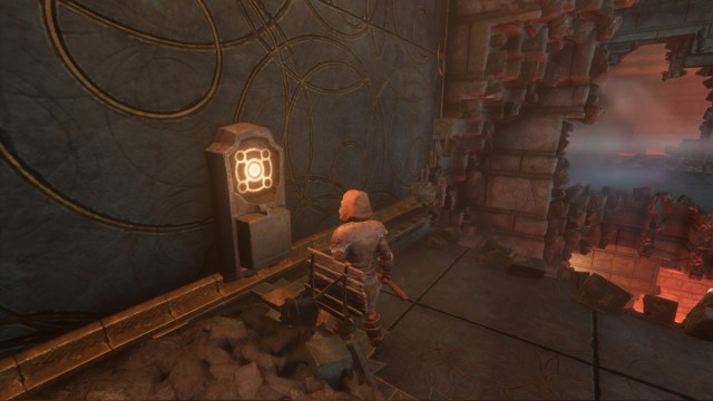 You’ll find the first switch at the back of this room. Approach it and press the button shown on the screen to activate it. One down, two more to go. Thankfully, they’re not as difficult to get to, but they can be just as confusing to find. Head to the right out of this room and get ready to encounter the next switch.