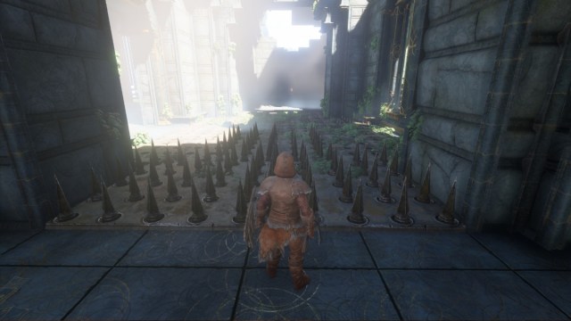 Keep walking down this path until you encounter a door that can be opened, leading you to your final obstacle — the Spike Pit. Press the button shown on your screen to open this door, and head in. Be sure to watch the spikes on the floor to learn their pattern, as they can easily kill you.