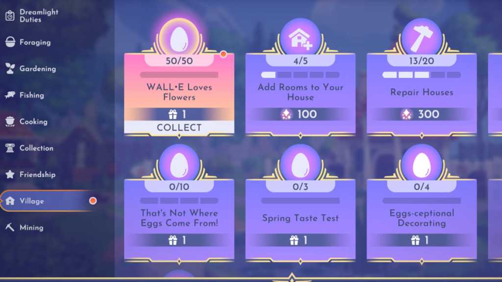 After picking up 50 flowers with WALL-E, head into the Dreamlight Duties list and select Village. You’ll find your list of tasks, including WALL-E Loves Flowers. Once you redeem the completed duty, you’ll receive the Decorative Tulip Bouquet as a reward!