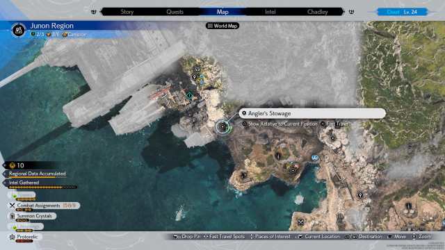 Even if you have a checkpoint that’s close to the Crow’s Nest, which is to the far east of the Junon region, you can’t just fast-travel there to expedite this quest. You must head to the Angler’s Stowage fast travel point, where Salmon will be waiting. Speak to Salmon, and you’ll get the prompt, “Follow Salmon?”