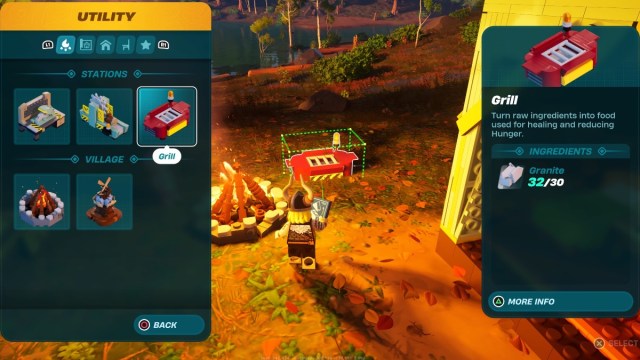 To cook food, you need to craft a grill with 30 Granite and then deposit ingredients such as meat, corn, or eggs. Before you can place a grill down, you need to have a Crafting Bench in the area that allows you to make some basic designs around your camp. When you open up the recipe list after making the bench, you can find the red grill in the utility section.