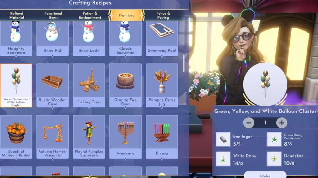 Sometimes, though, you’ll run into a particular task that has you wondering where to start or whether you can plan ahead. Making balloon arches and clusters is a great example of this, mainly due to their difficulty. If you want to learn more, continue reading to discover how to craft a Green, Yellow and White Balloon Cluster in Disney Dreamlight Valley.