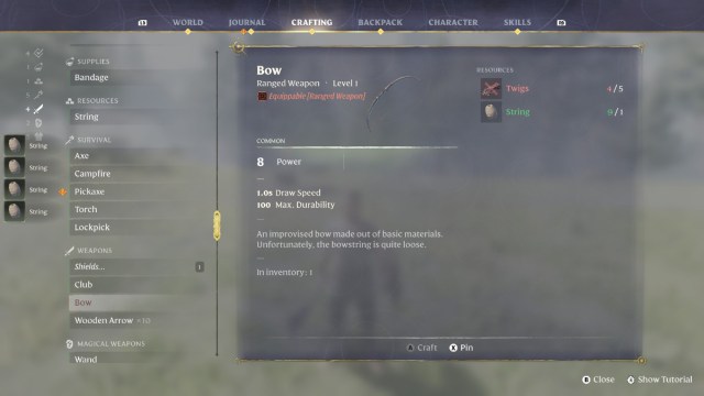 On the subject of Strings and Bows, if you’re hoping to craft one of your own, keep harvesting those Saplings, as you’ll need the following materials to craft a bow of your own: