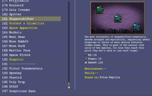 When you open the Bestiary, you will see that it has quite a few new faces, and as usual, the enemies that count as Suspicious Looking are the ones with yellow-colored names. I have highlighted the Shapeunshifter, which looks like a typical Among Us character, but it seems that it does not count!