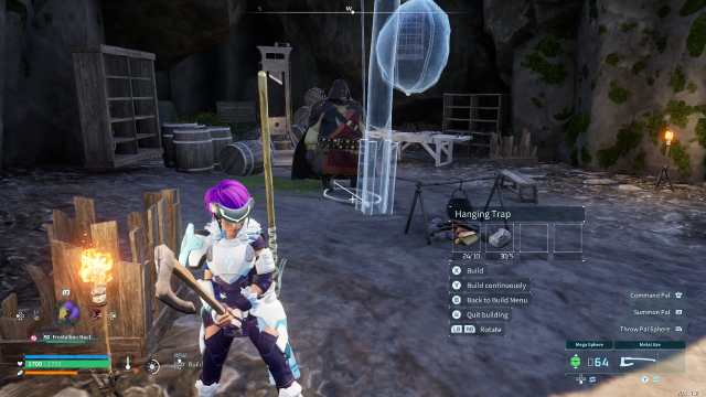 While wood is plentiful around the Black Marketeers’ location, you’ll need to hunt for stone. So it’s a good idea to have as much of it as possible on you before you start this farm, just for efficiency’s sake. Once you’ve found the Black Marketeer, open your build menu and select the Hanging Trap.