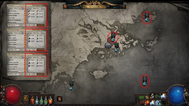 The best way to farm Runes is through shipping. If you notice the ports circled in the image above, you’ll see a silver or runic icon on their banner. These ports will give Runes as a bonus reward for completing trades. It doesn’t matter which resources you send; as long as you are trading through these ports, you’ll get Runes as a reward when your crew arrives back in Kingsmarch.