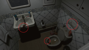 To investigate the bathroom you’ll need to click on the button above the toilet. Once you’ve done that, you’ll be able to move your camera around and catch all the clues.